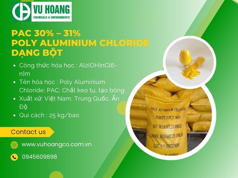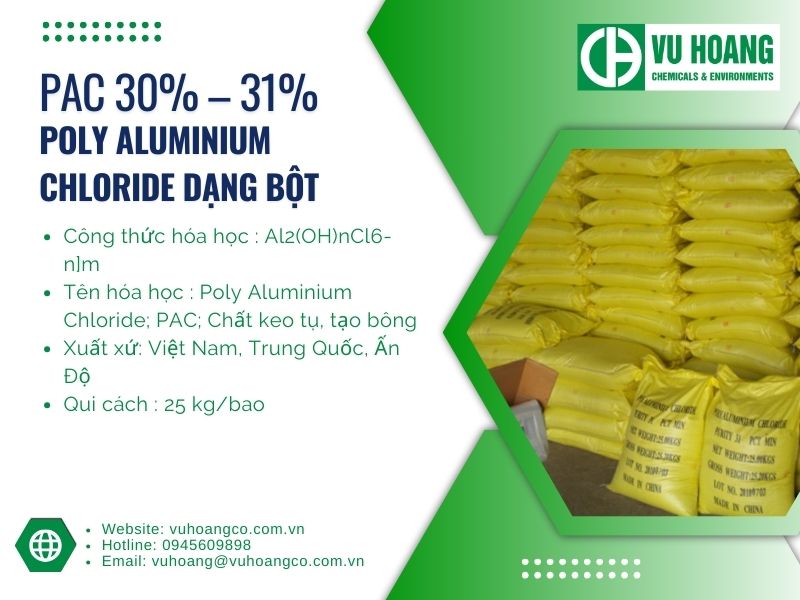 PAC Poly Aluminium Clorua là muối biến tính của nhôm clorua, có công thức phân tử là [Al2(OH)nCl6-n]m. PAC tồn tại ở dạng cao phân tử (polymer) và được sử dụng phổ biến trong xử lý nước cấp, nước thải, nước bể bơi và nuôi trồng thủy sản. PAC có hàm lượng nhôm khoảng 28 – 31%, giúp tăng hiệu quả trong quá trình lắng cặn bẩn trong nước và đảm bảo an toàn môi trường.